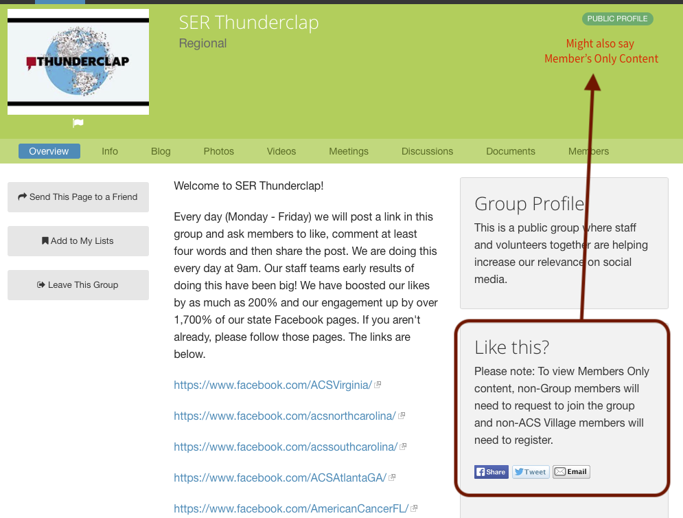 Ticket 103 - On the Group "Like This" sharing panel, we added a note about registration being requried to view Members Only Group content. We feel this helps users assess whether the people they want to share with would be able to view the content or be inclined to join ACS Village.