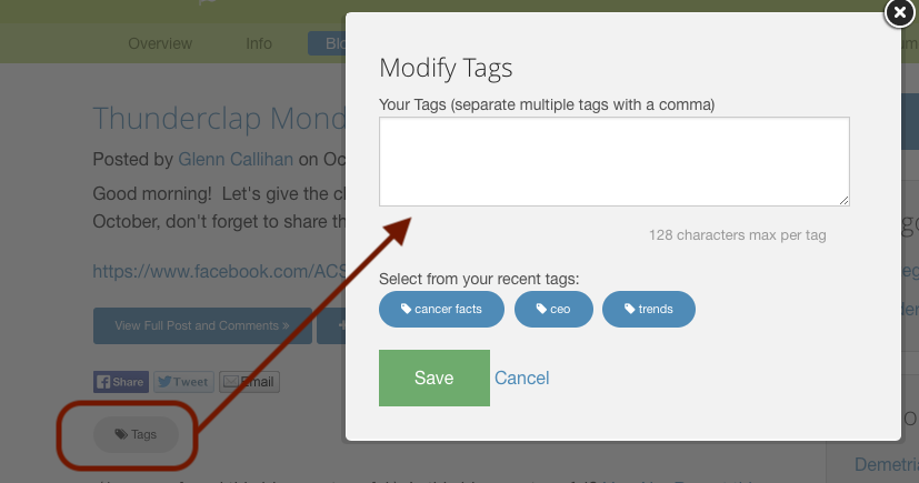Ticket 66 - In News & Group Updates, Photos and Documents, we resolved the inability to Add Tags. Tags allow you to add keywords to most content types like posts, photos, videos & documents so that you can easily search for related items.